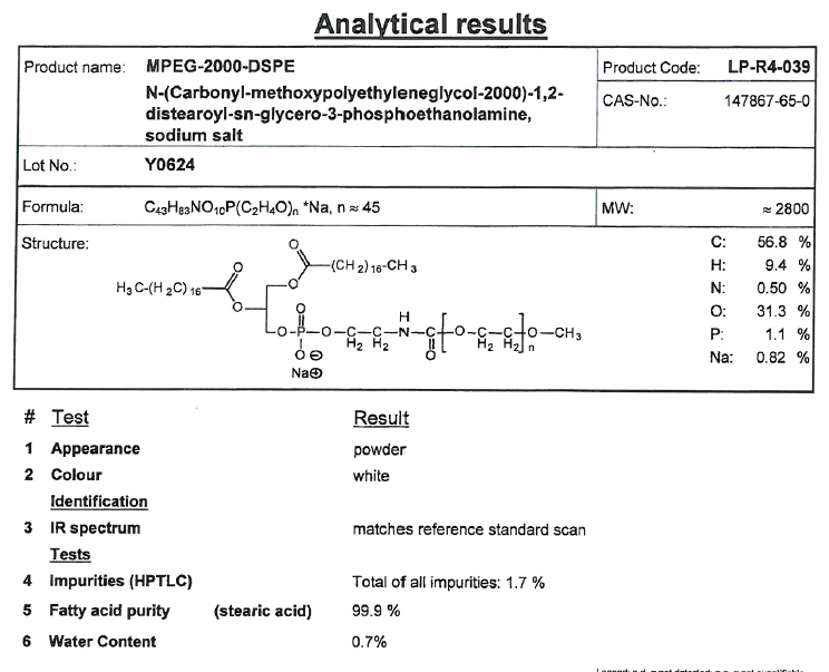 DSPE-PEG2000中文名:二硬脂酰基磷脂酰乙醇胺-聚乙二醇
