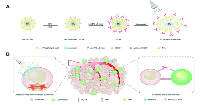 肺癌是很常见并且发病率最高的疾病之一,其中非小细胞肺癌(NSCLC)是主要类型,免疫疗法在癌症治疗中也十分重要,但药物不良反应限制了患者从PD1/PD-L1 检查点抑制剂药物治疗非小细胞肺癌(NSCLC) 中获益,据此科研团队成功研发了一种抗PD-L1单克隆抗体(mAb)偶联和负载多西紫杉醇的多功能脂质壳微泡(PDMs)采用生物安全磷脂设计,可产生协同抗**作用。