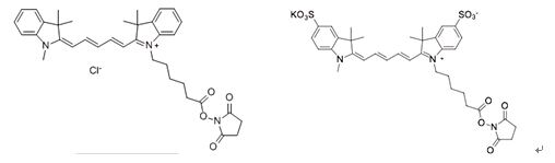 菁染料通常都是疏水,为了增加这类染料的亲水性,我们往往会引入强亲水性的磺酸基团来改善其水溶性,Cy5 NHS ester(疏水性),Sulfo-Cy5 NHS ester(亲水性)。