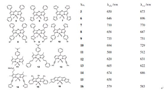通过扩大π-共轭体系获得的近红外BODIPY分子结构以及吸收和发射波长: