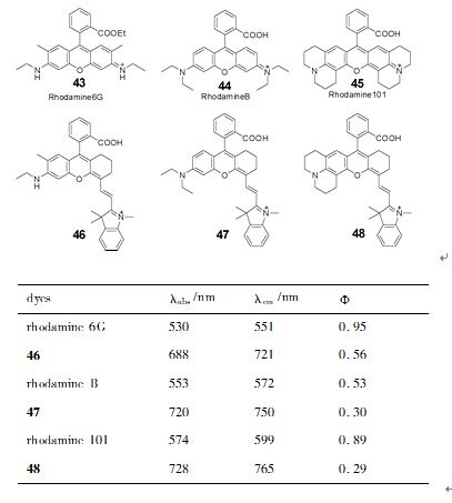 罗丹明是由3、6位氨基取代的氧杂蒽母体与9位碳原子取代芳基构成的一类有机荧光染料。经典的罗丹明染料如罗丹明B、罗丹明6G、罗丹明101的吸收/发射波长在可见光区(500~600nm),不适于生物体荧光成像。