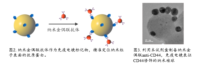 纳米金标记免疫电镜技术是目前应用广的免疫电镜标记物,该技术是将纳米金作为抗体的标记物,用于抗原的精确定位。在电镜下金颗粒电子密度高、圆形且界线清晰,易于辨认,定位精确;可以根据需要定制大小不同(5-100nm)的纳米金偶联抗体,因此可进行免疫电镜的双重或多重标记.